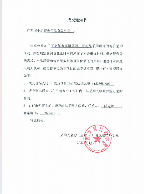 关于工会年末离退休职工慰问品采购项目成交结果公告