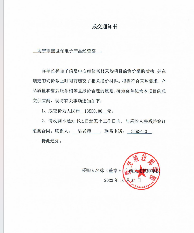 关于信息中心维修耗材采购成交结果公告