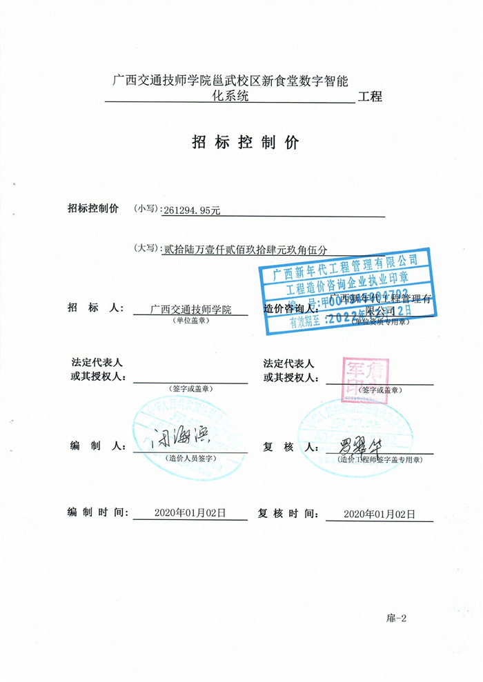 我单位拟采购邕武校区新食堂监控设备采购项目(详见招标文件),特邀请贵公司参加本次询价并进行报价。若贵公司有意参与竞价,收到邀请函后请于2020年12月 3 日15:00-17:00 期间将报价文件密封在信封内交到我院资产管理中心(综合楼1514办公室,联系人:朱湘萍,电话:0771-3393443)。管理中心负责组织院内专家进行开标,最终以最低价确定中标合作单位。