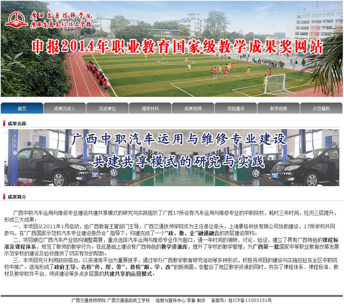 3月12日,由我院信息与宣传中心精心设计、连夜完成的“申报2014年职业教育国家级教学成果奖网站”成功开通上线。根据《教育部关于开展2014年国家级教学成果奖评审工作的通知》(教师〔2013〕14号)精神,该网站内容设计包括成果简介、成果完成人、完成单位、推荐材料、成果视频、项目建设、教学成果和示范辐射等八大栏目,多角度、多层次呈现我院“广西中职汽车运用与维修专业建设共建共享模式的研究与实践”科研课题项目的立项、建设以及获奖等方面的内容,为我院申报教育部2014年职业教育国家级教学成果奖提供强大的网络支撑平台。