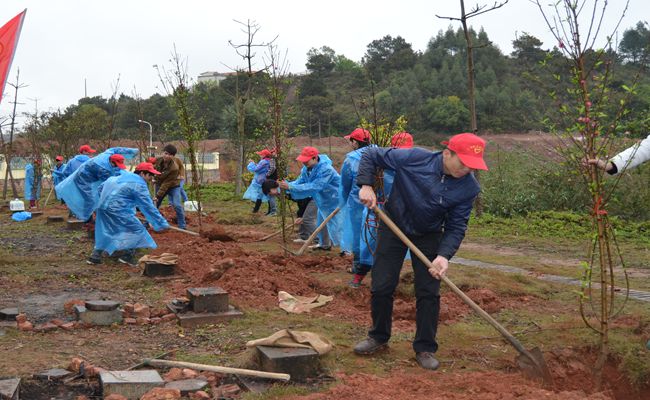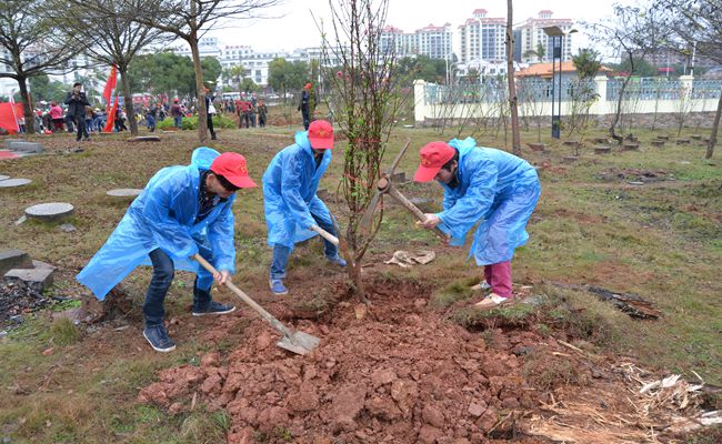 植树活动在五合大道的邕江边举行,简短的动员仪式后,同学们便迫不及待的拿起工具进行植树活动。在植树活动中,老师和同学们分成三人一组,各组分工协作,有的扛树苗,有的堆土,有的提水。经过大家的努力配合,我们在邕江边种下了一棵棵的桃树。
