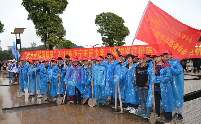 3月11日上午,我院青年志愿者在学院团委杨霜老师、学生工作处苏啟棠老师和覃柳红老师的带领下,参加了由共青团南宁市委组织开展的“我为世锦添光彩”2014年南宁市青少年“保护邕江母亲河”植树造林统一行动日活动。