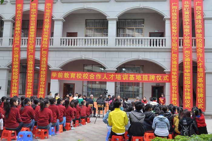 韦红教院长在揭牌仪式讲话中介绍了我院的基本情况,他指出,我院于2013年增设了幼儿教育等专业,并于秋季学期招收第一届幼教专业学生,目前该专业在校生数为90人。学院设有幼师专业工艺美术实训室、声乐实训室、形体训练室,配备有先进的钢琴、电子琴、葫芦丝等教学设备,开设有形体、声乐、舞蹈、美工等相关课程,目前拥有37名专业教师,学院计划在今年筹办运营一所能容纳500人的幼儿园。韦院长表示,此次揭牌仪式是我院与5所幼儿园开展全方位、深层次长期合作的开始,标志着我院校校合作迈上新台阶,为合作双方的持续、科学、健康发展提供广阔的空间。我院将本着真诚合作、共谋发展的宗旨,加强人才培养、资源共享等方面深层次合作,建设好实习实训基地,实现优势互补,为我区幼儿教育事业培养更多的实用型、复合型人才。他相信,今后的校校合作也必将更加坚实,更加充满朝气和活力。