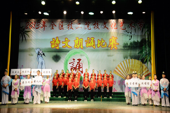 12月21日下午,由广西壮族自治区人力资源和社会保障厅主办、广西技工学校研究会协办的2013年全区技工院校文化艺术节诗文朗诵比赛(学生组)圆满落幕。我院59名学生组成的参赛队表现优异,喜获该比赛一等奖。