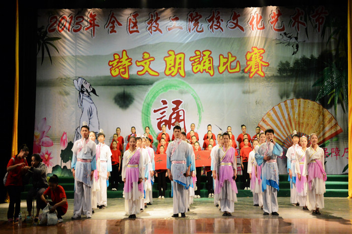 参加此次比赛共有来自全区22所中职院校的37支队伍。“弟子规,圣人训,首孝弟,次谨信,泛爱众,而亲仁,有余力,则学文······”我院学生铿锵有力、声情并茂的诵读立刻感染了现场的观众,将中华传统文化在悠扬的音乐中款款道来。我院学生还在朗诵中插入情境表演,逼真有趣的演出、朝气蓬勃的朗诵赢得观众们热烈的掌声,充分展示了我院学子自信大方、积极向上的精神风貌。