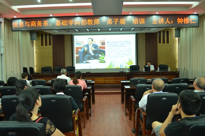 学习和践行《弟子规》是我院的德育教育工作的特色,是国家示范校建设中特色项目的内容。10月16日,我院信息与商务系、基础学科部的全体老师在信息中心会议室进行《弟子规》传统文化学习,由学院副院长、《弟子规》讲师团团长钟修仁主讲。