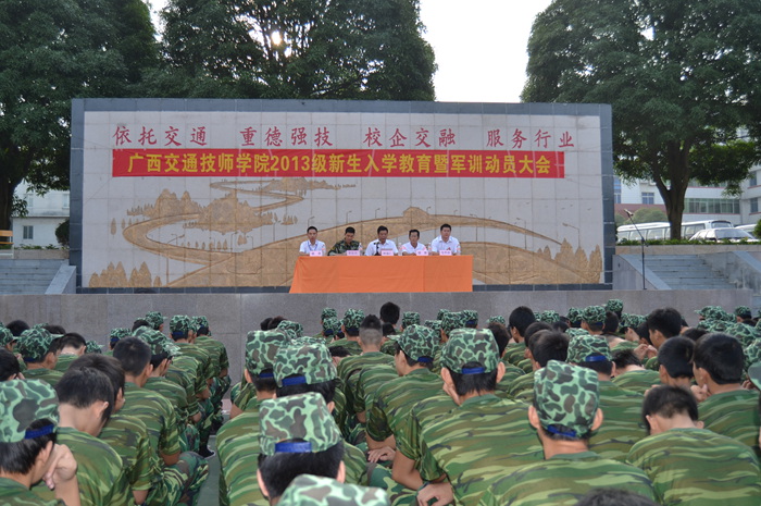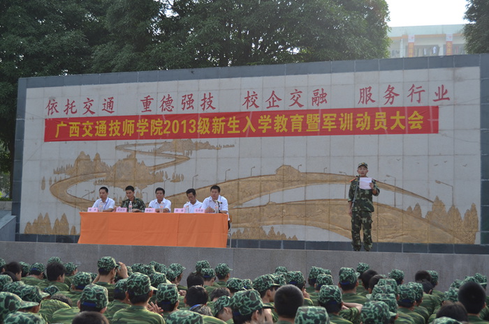 大会在庄严的国歌声中拉开了帷幕,钟修仁副院长发表了热情洋溢的讲话,他首先代表全院师生员工对教官们表示了热烈的欢迎,向教官和同学们介绍了我院的基本情况和发展前景。他指出,同学们到广西交通技师学院就读,是人生道路上的一个新起点。在新的环境中,同学们要积极调整心态,尽快完成角色转变,以饱满的精神状态迎接新的校园生活,他希望同学们在新的环境中要加强学习,提高自己的思想道德素质、文化素质、动手能力和创新能力,注重自己综合素质的培养。覃振周中队长对参加军训的新生们提出了要求:要充分发扬吃苦耐劳的精神,军训是一个艰苦的过程,是对同学们意志力的考验,希望同学们要真正明白军训的意义,发扬军队艰苦风斗的优良传统,要以饱满的热情投入到训练中去,圆满完成训练任务,要严守纪律,军训也是一个提高个人组织纪律性的过程,希望同学们严格要求自己,严格遵守训练规定,要一切行动听指挥。会上,教官代表和新生代表也进行了慷慨激昂的发言。军训动员大会在热烈的掌声中圆满结束,接着各军训小分队按照训练计划,分别开始了第一次训练。