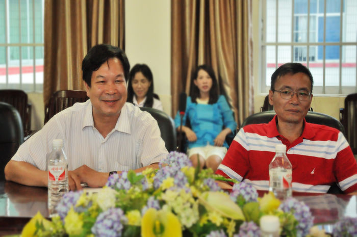 广西技工教研室副主任陈家和(右)自治区人力资源和社会保障厅职业能力建设处陈振成主任(左)