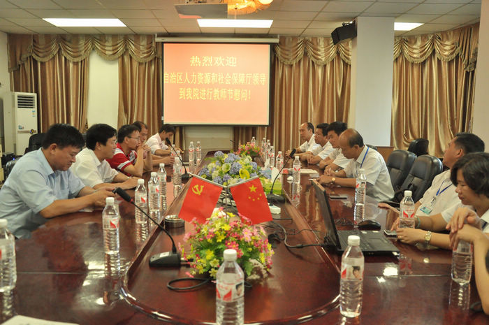 自治区人力资源和社会保障厅的领导认真听取了韦红教院长关于学院软、硬件设施建设、2013年秋季招生、教育教学、师资配备、取得成绩和学校发展规划等工作的汇报,并与教师代表交谈,广泛征求大家对职业教育工作的意见、建议,并向全院教育工作者们表示亲切的问候和节日的祝福。
