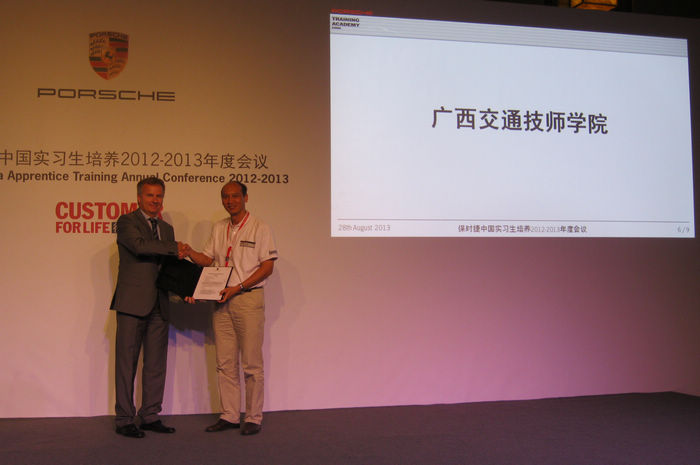 保时捷(中国)实习生培养2012-2013年度会议于2013年8月28-29日在中国古城西安万达希尔顿酒店隆重举行。参加会议的有保时捷(中国)培训学院高级经理费杰先生、保时捷(中国)服务培训经理吴珂先生、保时捷(中国)学徒项目专员李衡先生,全国保时捷校企合作院校领导代表及来自全国各地43家保时捷中心的经理等100多人。会议由保时捷(中国)服务培训经理吴珂先生主持。此次会议的主要内容是总结过去一年来保时捷(中国)校企合作项目所取得的成绩和经验,并简要介绍了该项目2014年度工作计划。