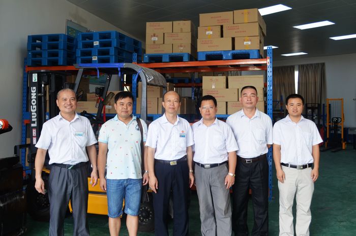 图为校企合作企业——东兴万通公司与我院领及相关系部负责人在我院物流实训中心合影