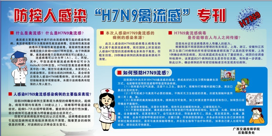 关于近期出现的H7N9新型禽流感疫情,我院领导高度重视,在学院领导的指示下,我处在饮食、生活、医疗等业务方面范围内,严格要求和部署,做好防控工作。